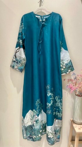 PRINTED BLUE GREEN LINEN LONGSLEEVE DRESS